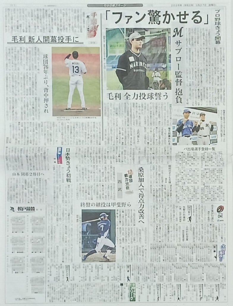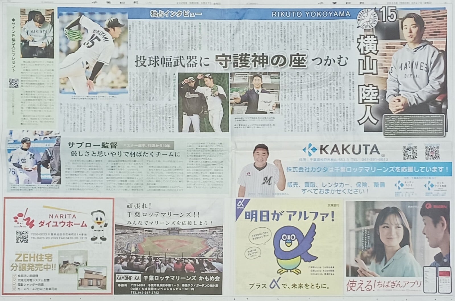 26/3/27千葉日報 プロ野球開幕マリーンズ横山陸人インタビューラッピング特集